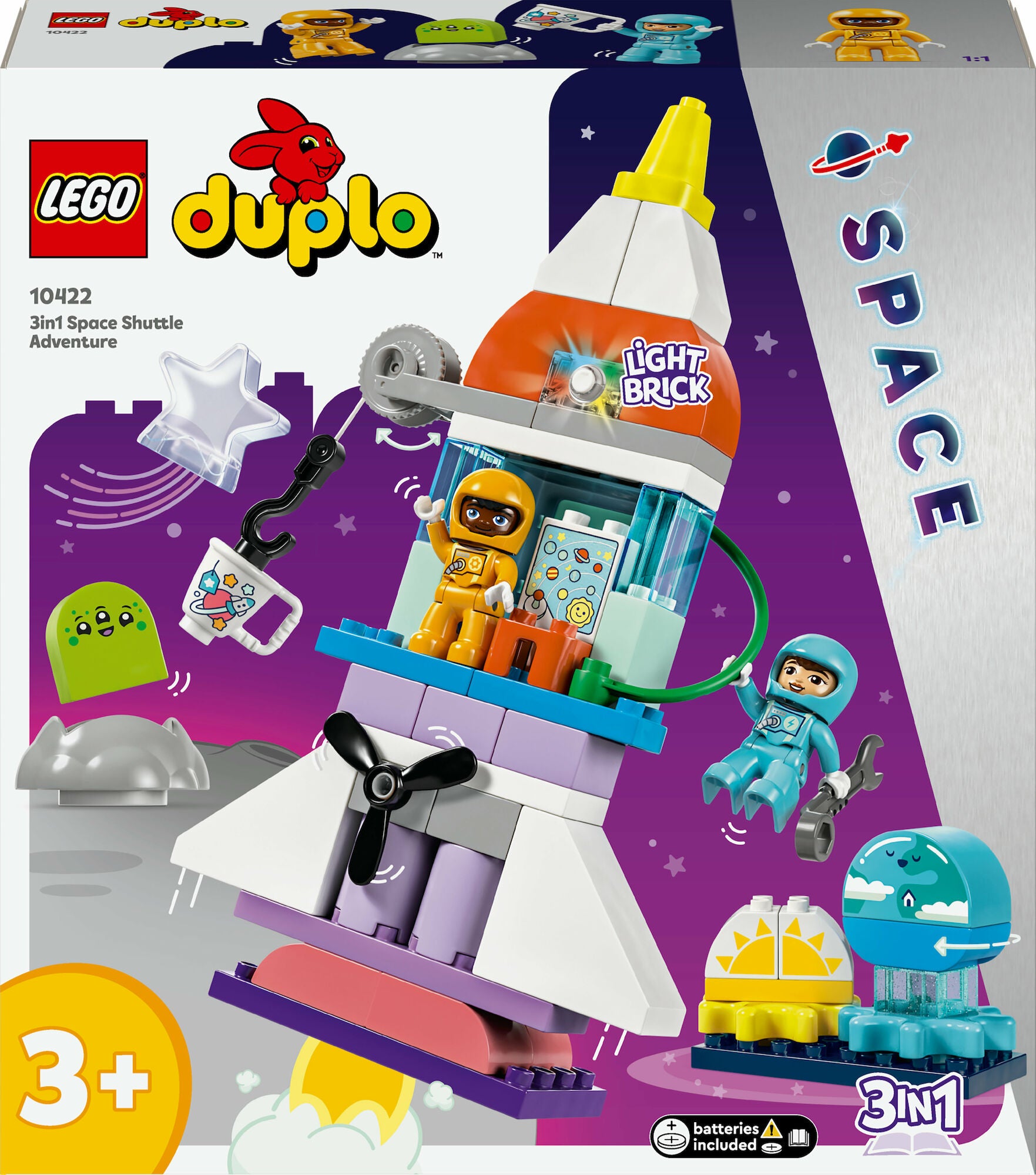 3... 2... 1... Drøn ud i aktivitetsfyldt legetid med legetøjet 3-i-1-eventyr med rumfærge 10422, der kan bygges og ombygges. Fantasien flyver højt, når små børn fra 3 år leger astronauter, der udforsker galaksen i et legetøjsrumskib, møder rumvæsner og lærer om solsystemet. Rumlegetøjet er fyldt med sjovt tilbehør, der sætter gang i kreativ leg. Børnehavebørn udforsker nye horisonter, når de opfinder sjove eventyr i det ydre rum med de 2 LEGO DUPLO astronautfigurer, f.eks. at blive venner med et rumvæsen eller tage på rumvandring for at reparere raketten med deres legetøjs-skruenøgle. Legen føles ny hver gang med dette fleksible 3-i-1-byggesæt, der indeholder masser af interessante klodser og elementer, som kan ombygges til 2 andre legetøjsrumskibe, en planetbase, eller hvad de mindste ellers kan finde på! Med drejelige tandhjul og propel, fungerende kranspil, hængslede døre og en lysklods hjælper dette sjove læringslegetøj også små børn med at udvikle finmotorikken. Klodsbygget 3-i-1-rumlegetøj giver små børn timevis af sjov med at bygge og ombygge Det alsidige legetøjsrumskib indeholder 58 klodser samt 2 LEGO DUPLO figurer Et læringslegetøj, der hjælper de mindste med at udvikle finmotorikken Der medfølger batterier, så små børn kan drage ud på den sjove rumoplevelse uden forsinkelse Videnskabsbaseret gave til små børn fra 3 år, der elsker legetøjsrumskibe LEGO DUPLO byggesæt garanterer en sikker legeoplevelse LEGO DUPLO legetøj inspirerer små børn til at drømme stort om verden og universet Sættet med 58 elementer omfatter en raketmodel, der er over 35 cm høj