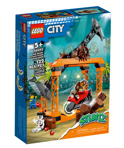 LEGO City Stuntudfordring Med Hajangreb Skru op for den actionfyldte leg med dette LEGO City sæt. Aktiver og send den svinghjulsdrevne motorcykel afsted. Undgå skelettet og det roterende hajhjul, og pas på ikke at ramme tønderne og afsløre piraternes skju