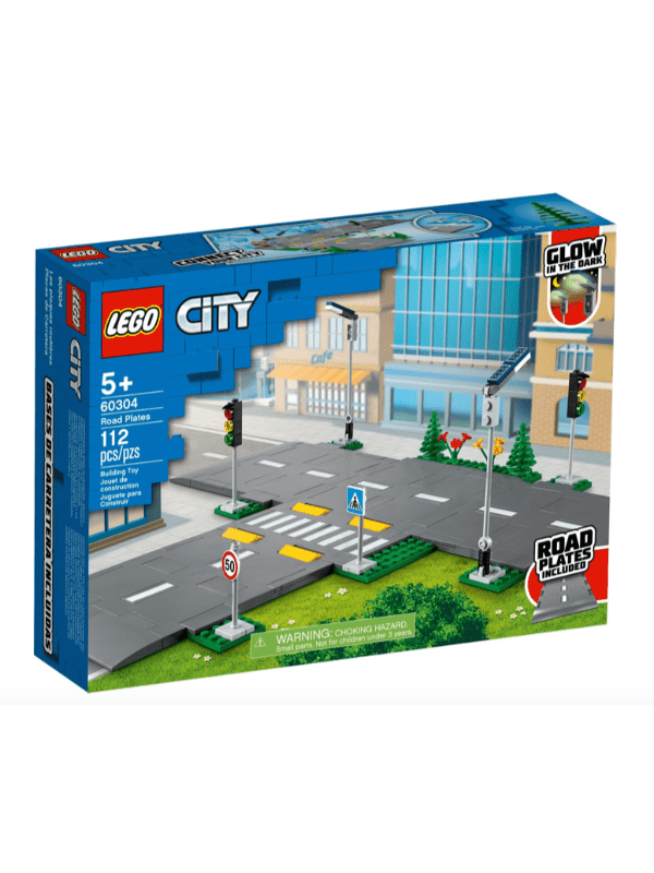 Alder 5 år+ LEGO City Vejplader I dette sæt får du 5 LEGO vejplader med trafikbanestriber, fartbump og en fodgængerovergang. Der er selvlysende gadelygter, legetøjstrafiklys, vejskilte, træer og grønne områder. Perfekt til at bygge en by og forbinde det m