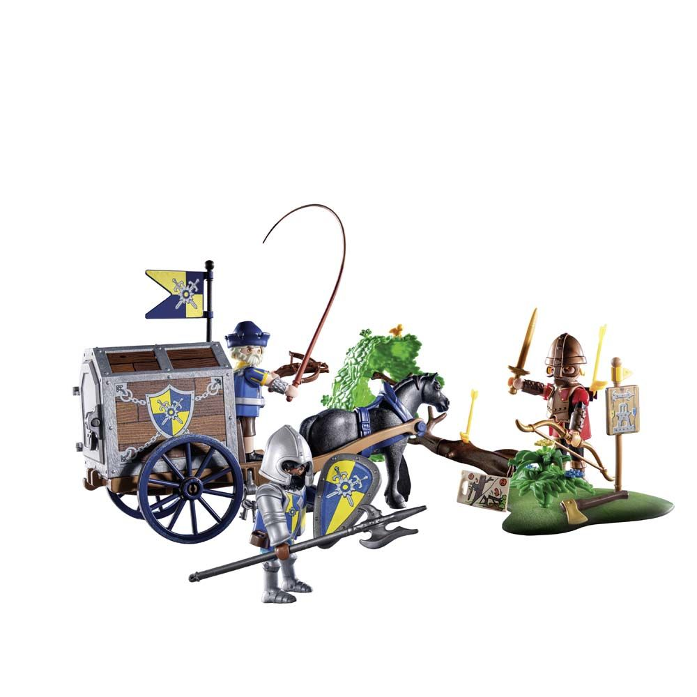 Værdifuld last læsset! Novelmorianerne har drageguld om bord sammen med byggetegninger for specialvåben. En ridder fra Burnham Raiders forsøger at stoppe transportvognen ved hjælp af et fældet træ. Novelmore Knights legeverden fra PLAYMOBIL er fuld af ov
