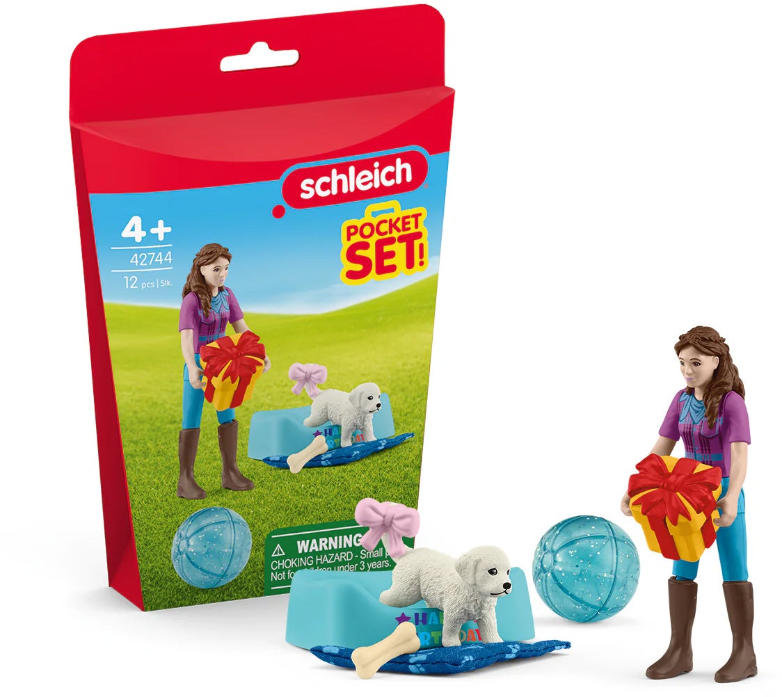Sjovt legesæt fra Schleich med en figur og sjovt tilbehør. Perfekt til timevis af fantasifuld leg. - Indeholder: 1 figur, 1 hundehvalp, 1 hundekurv, 1 hundetæppe, 1 badebold, 1 gnaveben, 1 gave, 1 sløjfe, 1 klistermærkeark. - Dekorér legesættet med de medfølgende klistermærker. - Detaljeret design. - Saml på alle produkterne i serien. - CE-mærket. - Anbefalet alder: Fra 4 år. - Plastik.
