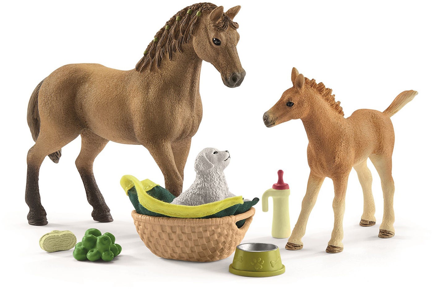 Det er et sjovt legesæt fra Schleich med to heste og en sød lille hundehvalp! Sættet består af en quaterhoppe, et quaterføl og en hundehvalp samt tilbehør i form af hundekurv med tæppe, en madskål, en sutteflaske, en strigle og en høj med grønne æbler. Sara passer de nyfødte dyreunger. Hun børster føllet med massagebørsten og mader bade føllet og hvalpen mens hoppen passer på sit lille føl. Anbefalet alder: Fra 3 år. Mål: B24,5 x D5,2 x H19 cm. Materiale: Plast.