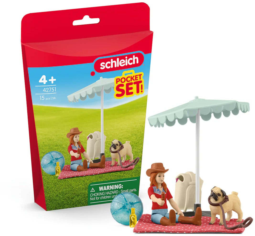 Sjovt legesæt fra Schleich med en figur og sjovt tilbehør. Perfekt til timevis af fantasifuld leg. - Indeholder: 1 figur, 1 mopshvalp, 1 picnictæppe, 1 hat, 1 parasol, 1 badebold, 1 rygsæk, 1 flaske, 1 pølse, 1 hundesnor. - Detaljeret design. - Saml på alle produkterne i serien. - CE-mærket. - Anbefalet alder: Fra 4 år. - Plastik.