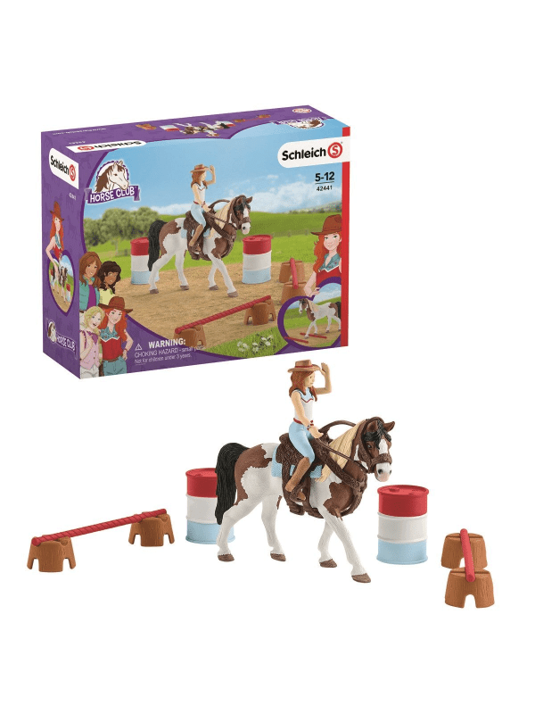 Schleich Horse Club Hanna's Western Ridekonkurrence Sæt Hannas Western ridekonkurrence indholder alt hvad du skal bruge til at afholde konkurrencen. Der medfølger Hanna og hendes smukke Tennessee Walker hoppe med aftagelig sadel og trens, samt tønder