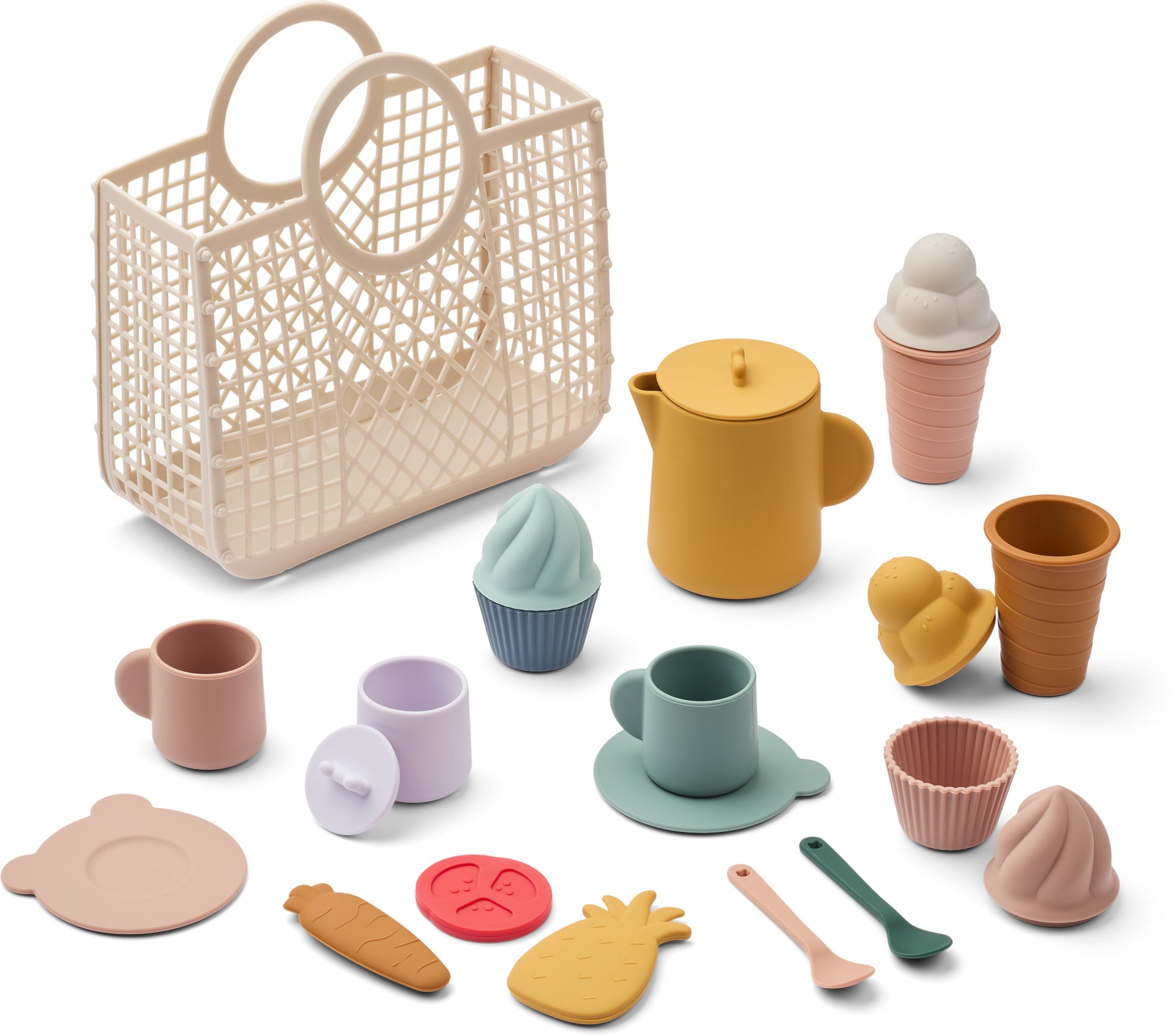 Picnicsæt fra LIEWOOD med søde fødevarer. Perfekt til kreativ rolleleg. - Sættet indeholder 2 cupcakes, 2 is, 3 slags madvarer, 2 tekopper med underkopper og teskeer, en tekande og en sukkerskål. - Leveres i den populære Samantha-kurv for let opbevaring. - Til sjov og fantasifuld rolleleg. - Mål: H 23 x B 23 x D 8,5 cm. - CE-mærket. - Anbefalet alder: Fra 5 år. - Pose: 60 % genanvendt polyethylen, 40 % polyethylen. - Fødevarer: 100 % silikone.