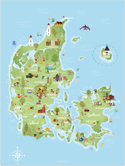 Super fint og detaljeret Danmarkskort til børn med alle de gode seværdigheder på i størrelsen...