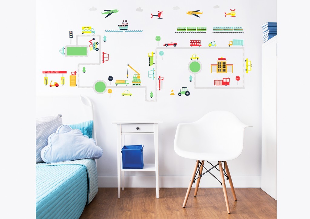 Bip Beep Vroom Vroom! Transform ethvert værelse med disse 61 Transport wallstickers med fly, tog og biler. Lav en scene komplet med veje, rundkørsler, trafiklys, brandstation og meget mere. Walltastic® Wall Stickers er aftagelige og genplacerbare, du kan