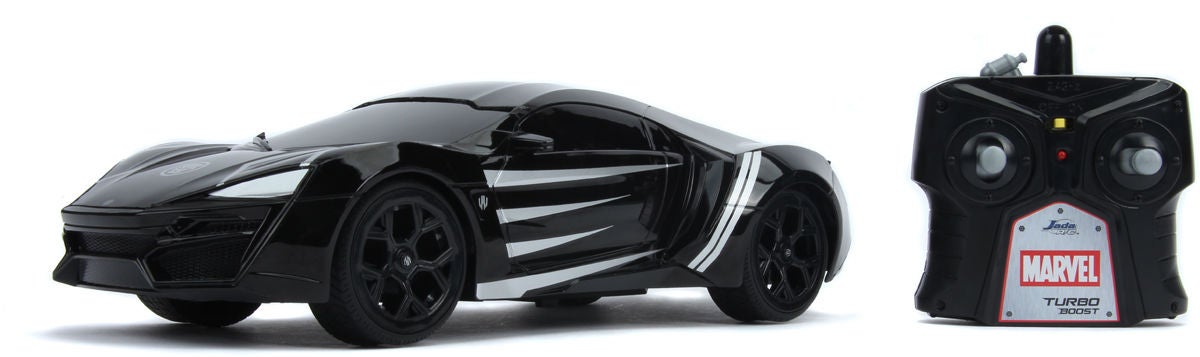 Den seje metalfigur Black Panther fra Marvel og hans fjernstyrede Lykan Hypersport suser rundt på vejene. Bilen er udstyret med frihjul, gummidæk, døre, motorhjelm, justerbar hækspoiler og detaljeret interiør. Bilen har en maks. hastighed på 8 km/t og kan køre både fremad, bagud og til højre og ventre. Tag med Black Panther på eventyr i hans hurtige bil og red mennesker i nød! Anbefalet alder: Fra 8 år.