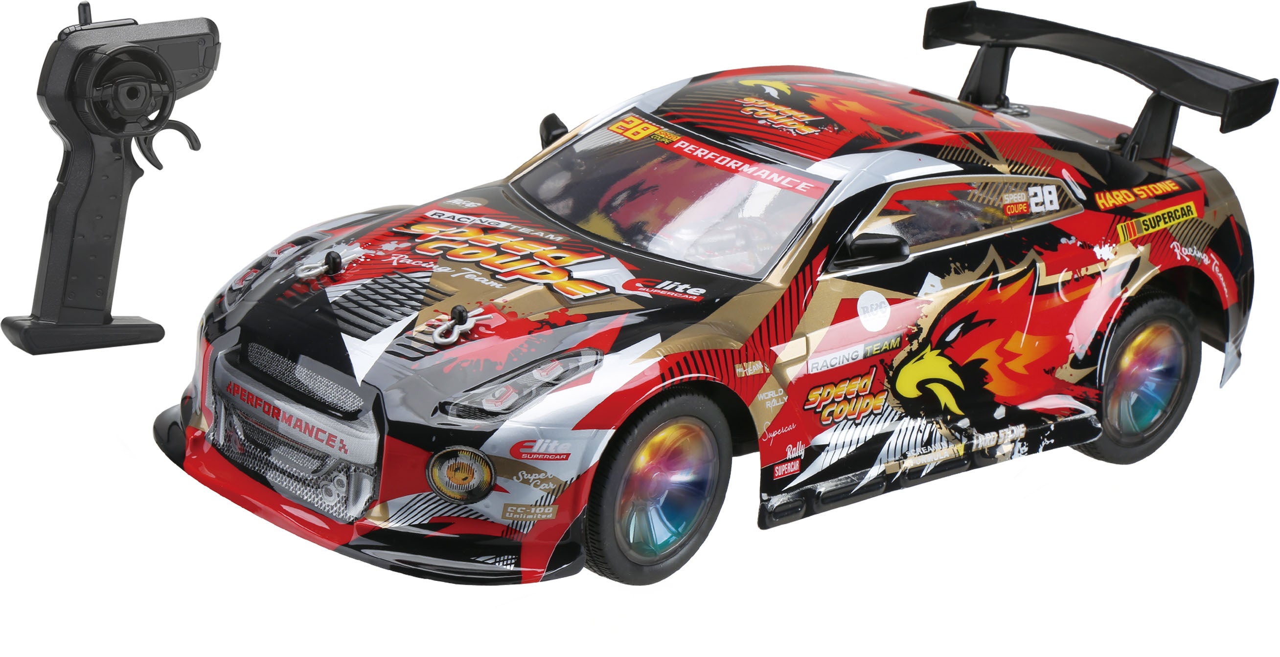 Fjernstyret bil fra Koolspeed med en fjernbetjening. Perfekt til fartfyldte eventyr. - Indeholder: 1 fjernstyret bil, 1 fjernbetjening. - Skala 1:10. - Indbygget affjedring. - Med lyseffekt. - Maks. hastighed 8 km/t. - Frekvens: 2,4 GHz. - Rækkevidde på op til 25 meter. - Gummidæk. - CE-mærket. - Anbefalet alder: Fra 3 år. - Plastik. - Batterier medfølger ikke.