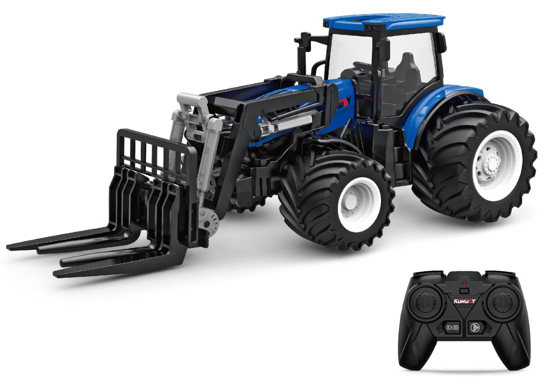Flot blå fjernstyret traktor med frontlęsser. Leveres med fjernbetjening og 2.4GHz teknologi som ikke giver forstyrrelser og gųr at flere fjernstyret kųretųjer kan kųre på samme tid. Medfųlger i pakken: 1 stk. Fjernstyret Traktor 1 stk. 2.4G Fjernbetjenin