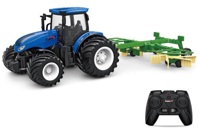 Flot blå fjernstyret traktor med høvogn. Leveres med fjernbetjening og 2.4GHz teknologi som ikke giver forstyrrelser og gør at flere fjernstyret køretøjer kan køre på samme tid. Medfølger i pakken: 1 stk. Fjernstyret Traktor 1 stk. 2.4G Fjernbetjening Spe