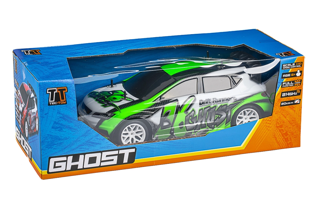 GHOST R/C 1:10 Tag styringen med Ghost 1:10 fjernstyret rallybil fra TEC-TOY, der kombinerer stil og fart i en imponerende pakke. Med sine lavprofildæk og aerodynamiske design er Ghost klar til action på både asfalt og terræn. Med en imponerende topfart