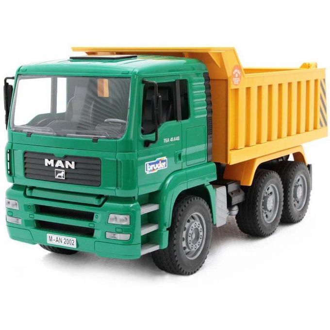 Denne MAN dumper er designet som en ægte vare. Dens funktioner omfatter et fremadtiltende førerhus for at se motorblokken samt foldbare sidespejle. Lastsengen vipper op, og baglågen åbnes for at losse, hvilket gør den til det bedste legetøj i sandkassen!