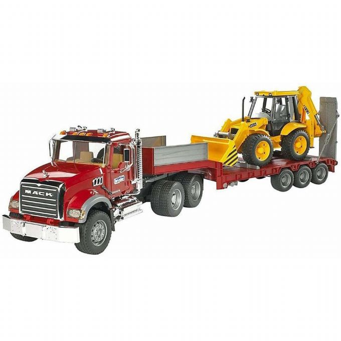 Sættet måler ca. 93 cm. Mack Truck med hænger hvorpå der står en JCB Gravemaskine. Den utroligt realistiske førerkabine har døre, der kan åbnes, en vippelig motorhjelm, der giver fuldt udsyn til motorblokken, og sammenfoldelige sidespejle. MACK granit f