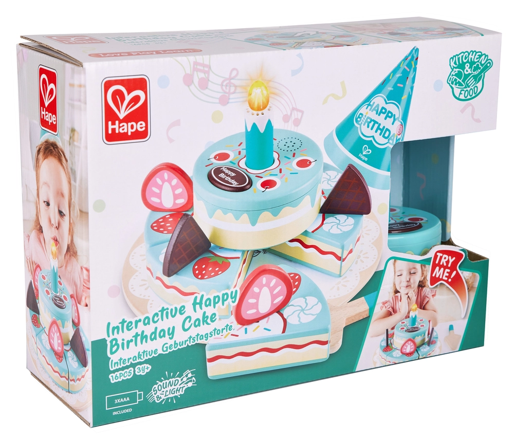 Fejr hver dag som en fødselsdag med Hape Interactive Birthday Cake. Dette charmerende legetøjssæt inviterer til kreativ leg og deling af glædelige stunder. • Interaktiv leg: Børn kan pynte kagen med farverige "flødeskum" toppe og dele den med ven