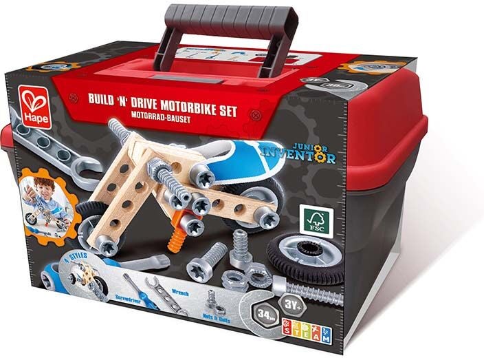 Motorcykelsæt fra Hape med en komplet værktøjskasse. Perfekt til kreative aktiviteter. CE-mærket. FSC-certificeret. Anbefalet alder: Fra 4 år.