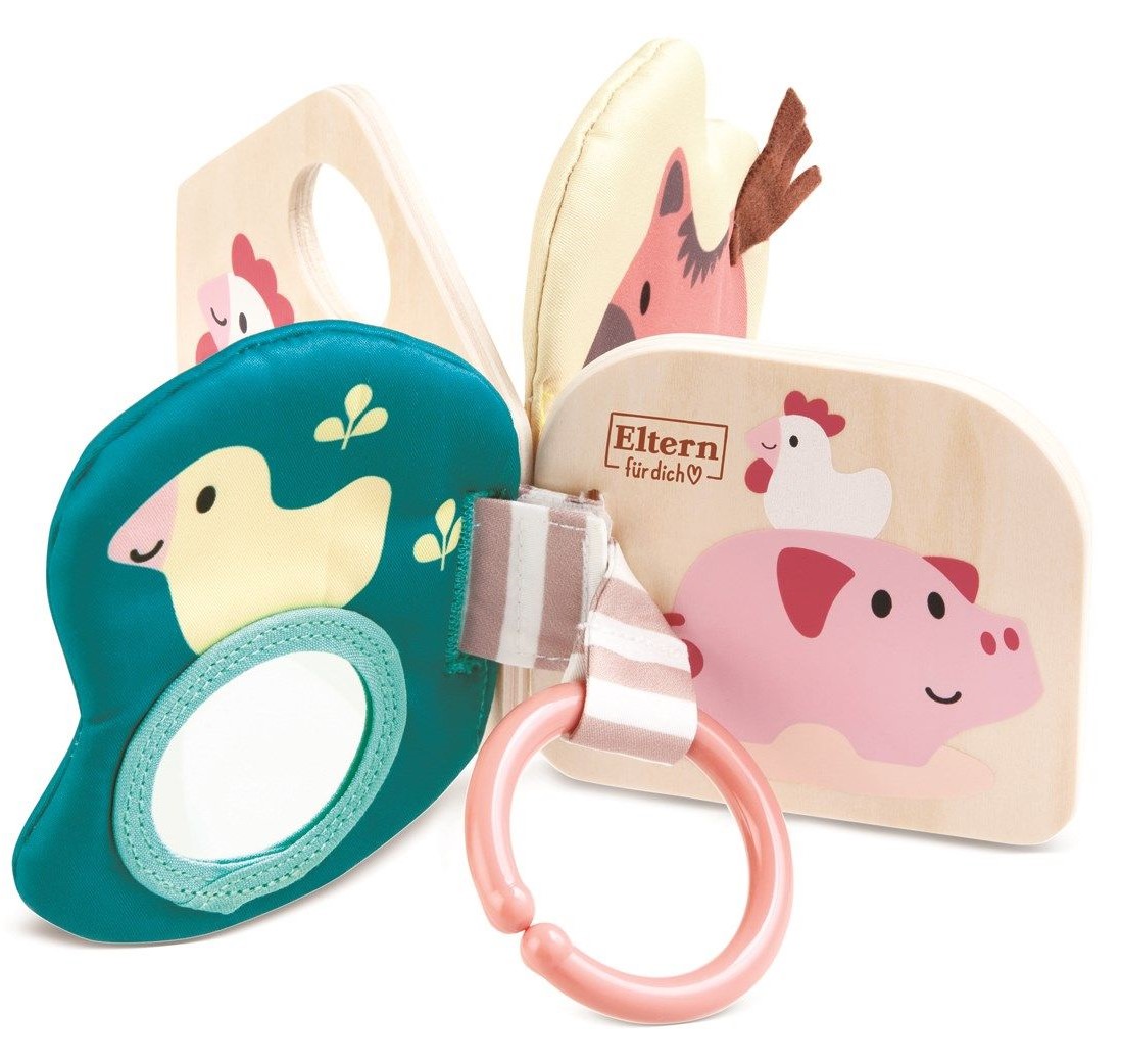 Sųd babybog på 10x10 cm med 8 forskellige dyr fordelt på 4 sider. Hver side har en sansestimulerende aktivitet, såsom spejl eller hale at nulre ved. Når I lęser bogen, kan I ųve dyrenes lyde eller måske hvad de hedder.På den måde er den fine trębabybog fuld af udviklende aktiviteter for dit lille barn.Babybogen har et smart ophęng, så du kan sętte den i autostolen, tremmesengen eller barnevognens kaleche.