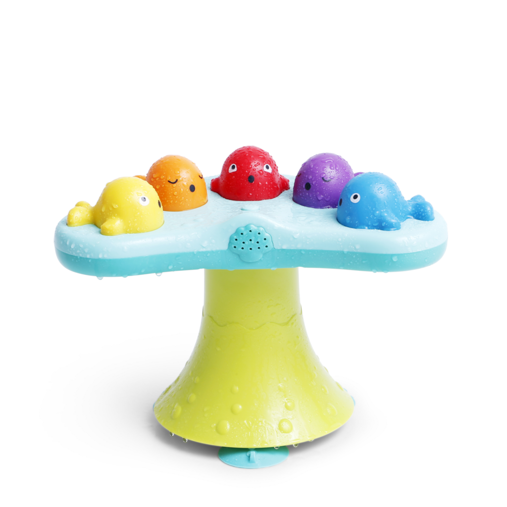 Sæt dette sjove hvalklaver på bunden af badekarret, så sætter det sig fast ved hjælp af sugekoppen. Tænd på knappen, og så går hvalerne i gang med at sprutte vand op af deres åndehuller.Samtidig spiller de 5 forskellige melodier. Dit barn kan også vælge selv at spille på hvalerne ved at bruge den anden indstilling. Så repræsenterer hver hval en tone.