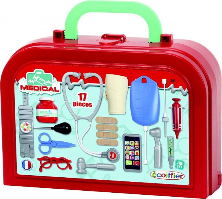 Ecoiffier deluxe læge kuffert! Vær en rigtig læge eller sygeplejerske og helbrede dine patienter! Kufferten indeholder alle de ting, du har brug for, for at hjælpe alle. Specifikationer: Farve:...