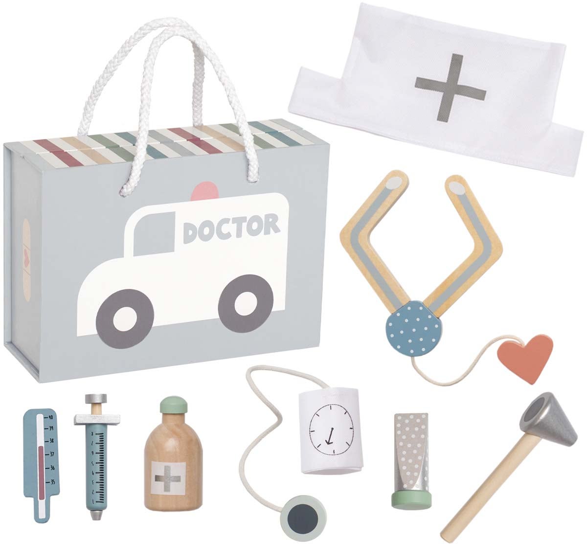 Lægetaske fra JaBaDaBaDo med en masse sjovt tilbehør. Perfekt til timevis af fantasifuld leg. - Antal dele: 9. - Indeholder: 1 lægetaske, 1 doktorhat, 1 stetoskop, 1 blodtryksmåler, 1 kanyle, 1 medicinflaske, 1 otoskop, 1 dåse med salve, 1 termometer. - Kun fantasien sætter grænserne. - CE-mærket. - Anbefalet alder: Fra 1,5 år. - Træ, karton, stof.