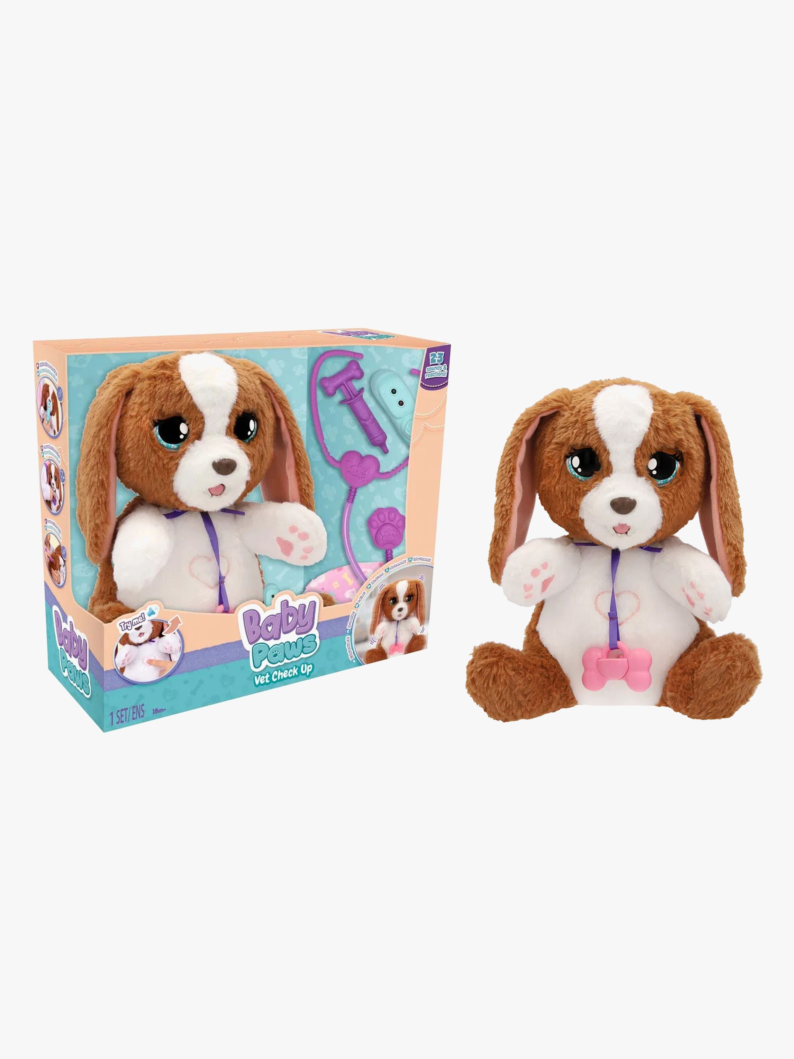 Hundehvalpen har 23 forskellige lyde og reaktioner, hvilket gør legen endnu mere livlig og underholdende. Den kan endda lukke øjnene, hvilket tilføjer en ekstra dimension til legesituationen. Med en blød krop er hvalpen behagelig at kramme og lege med.