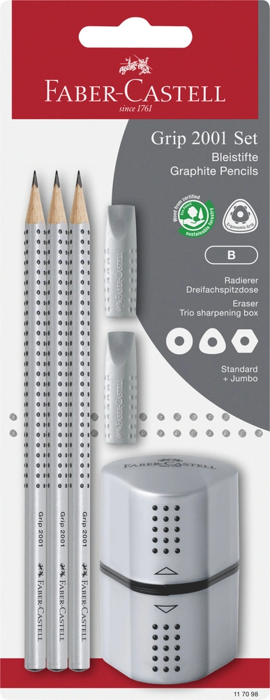 Faber-Castell Grip 2001 startsæt med 3 grå trekantede ergonomiske Grip 2001 B blyanter, praktisk blyantspidser til almindelige, jumbo blyanter med beholder og 2 stk. topviskelæder.