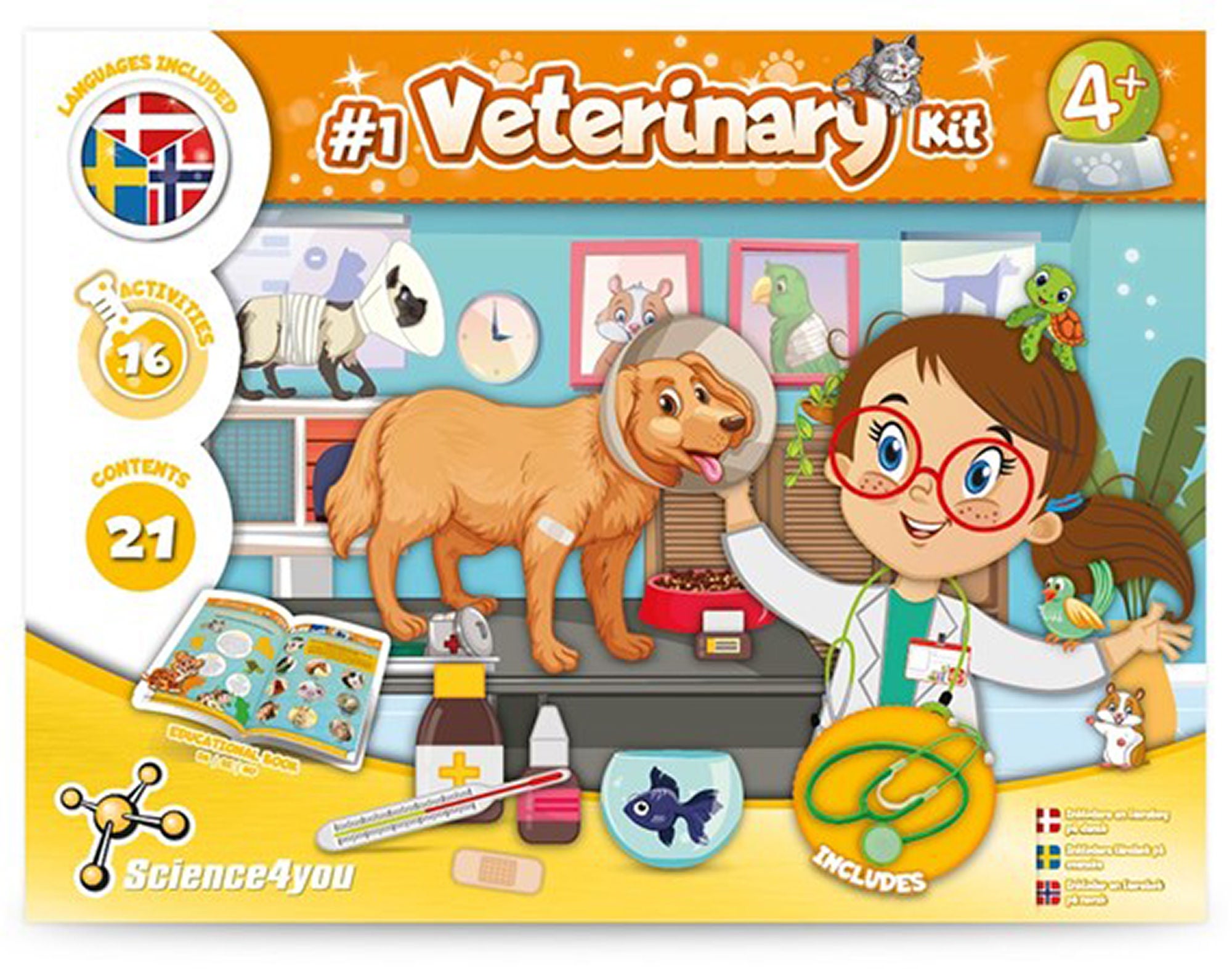 Mit første dyrlægesæt fra Science4you perfekt legetøj til kommende veterinærer, der brænder for dyr. Kom ind i en fantastisk dyrlæge-verden og lær, hvad veterinærer lavet samt, hvilke dyr de behandler. Se, hvordan vi kan holde vores firbenede venner friske og glade. Find ud, hvordan du: Identificerer forskellige typer af kæledyr, hvad de spiser, og hvordan man kan holde dem raske Måler temperaturen og tager blodprøver Studerer et røntgenbillede og applicerer bandage Bager lækre hundekiks Indeholder: Dyrlægekappe Stetoskop Kirurgisk maske Sprøjter Røntgenplade