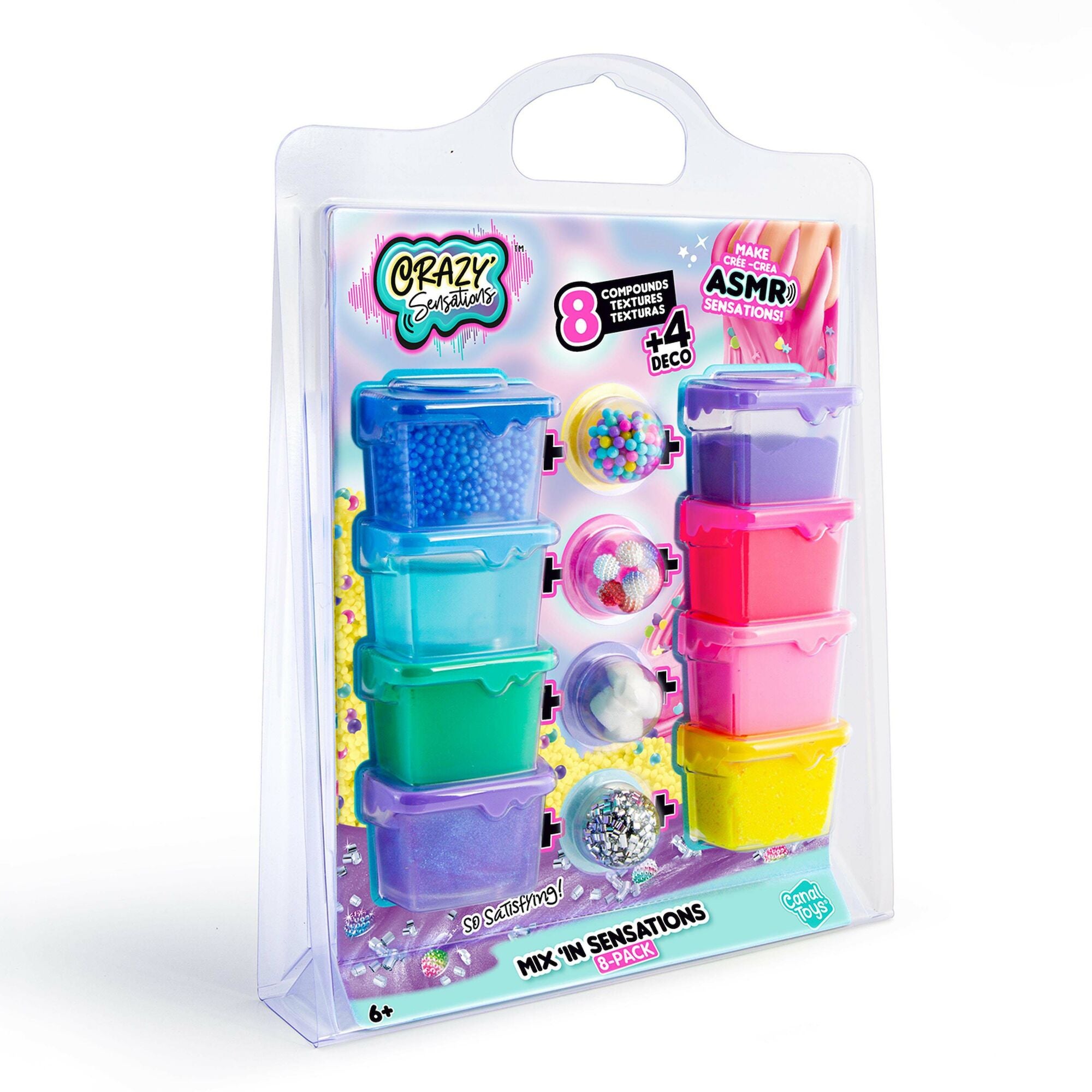 Otte forskellige teksturmasser fra Crazy Sensations med stabelbare dåser. Sættet indeholder fire pakker med dekorationer til teksturmasserne. Perfekte til mange timers sjov. 8-pak. CE-mærket. Anbefalet alder: Fra 6 år.