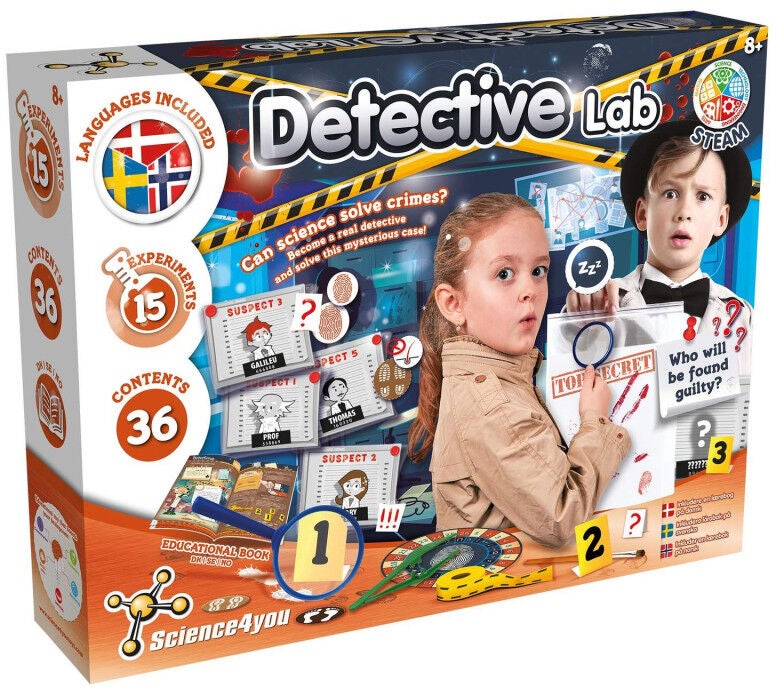 Detective Lab fra Science4you det perfekte legetøj til små detektiver. Kan videnskaben hjælpe med at løse forbrydelser? Bliv en rigtig detektiv og løs denne mystiske sag, gemt i den pædagogiske bog. Arbejd som en rigtig kriminaltekniker og lær, hvordan du afslører og identificerer finger- og skoaftryk, sender meddelelser til andre detektiver samt ekstraherer og analyserer DNA samt laver andre eksperimenter. Inkluderer: tape til gerningssted, forstørrelsesglas, fingeraftryksbørste, uddannelsesbog og mere.