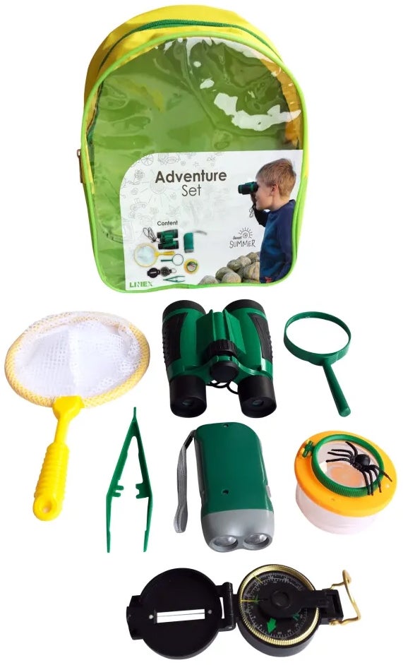 Opdagelsessæt fra Liniex med en praktisk rygsæk med en masse tilbehør til at udforske og lære om det omgivende miljø med. - Indeholder: 1 rygsæk, 1 kompas, 1 pincet, 1 observationsbakke, 1 forstørrelsesglas, 1 kikkert, 1 net, 1 lommelygte, 1 forstørrelsesglas. - En eventyrers bedste ven. - Let at medbringe og opbevare! - Sødt design. - Stimulerer fantasi og finmotorik. - CE-mærket. - Anbefalet alder: Fra 4 år. - Plastik.