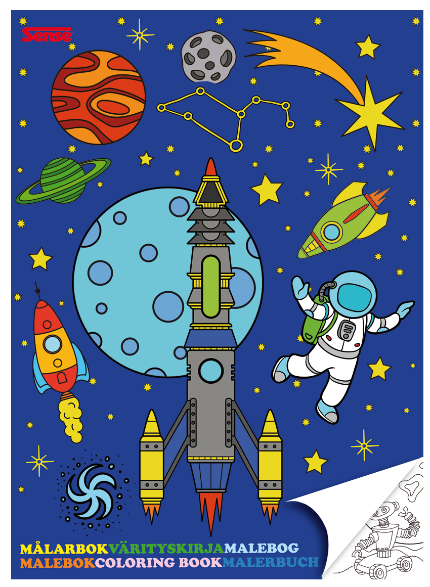 Den stolte astronaut er landet og sætter flaget i jorden. Men hov, der er jo helt farveløst på tegningen, så dit barn må finde farveblyanterne eller tusserne frem og komme i sving. Her får I 36 siders rumeventyr, der er klar til en gang farver.Snak om planeter, solsystemer og stjerneskud mens I farvelægger de mange små og store tegninger i malebogen. Det styrker dit barns ordforråd og kan styrke interessen for at vide mere om jorden og universet. Malebogen er oplagt at have med ud, hvor det kan blive liiidt kedeligt at være barn. Måske på bilturen eller til en større fest med lange taler.Malebogen er god som fødselsdagsgave, julegave og kalendergave.Billederne kan farvelægges med tusser eller med farveblyanter. Det styrker dit barns skrivegreb og finmotorik.Malebogen kan godt tåle at blive farvelagt med farvelade, men det kan kræve tålmodighed at vente på at den tørrer, så siderne ikke klistrer sammen, når I bladrer til en ny side.FSC-mærket papir.