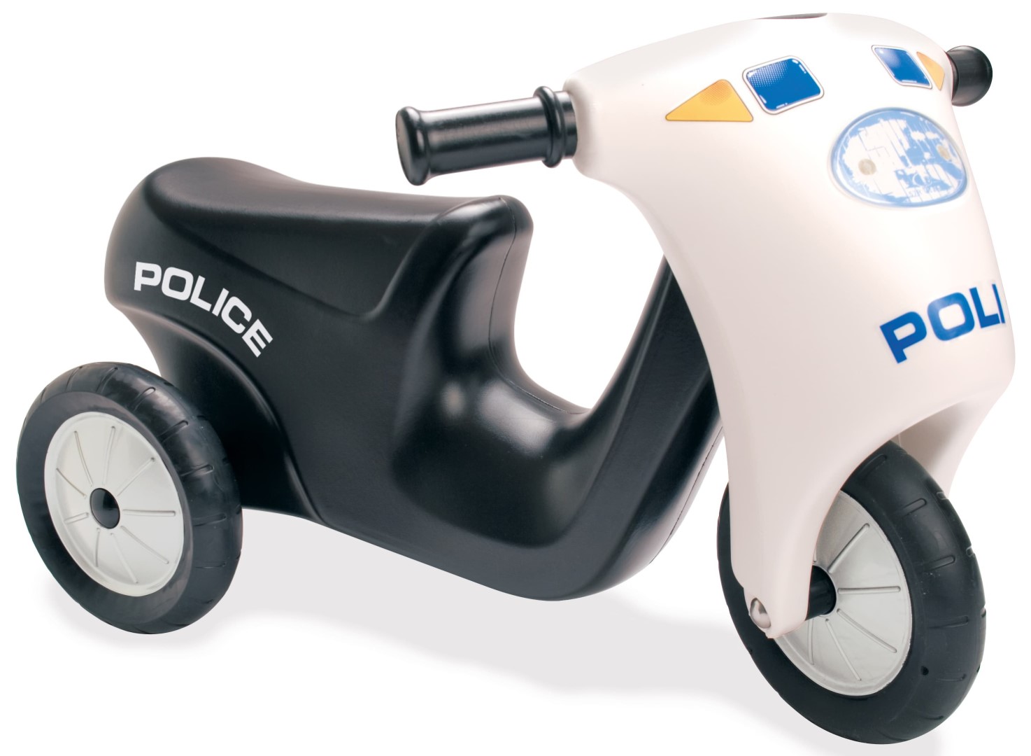 Classic politi scooter. L: 60 cm Dantoys politi scooter med gummihjul er det perfekte køretøj til små betjente i træning. Dette robuste køretøj er designet i klassiske sort-hvide politifarver og kommer med tre stabile hjul, der sikrer optimal balance og s