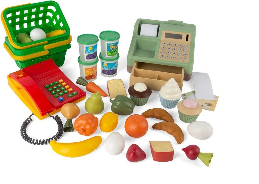 • Indeholder kasseapparat, indkøbskurv og legetøjsmad