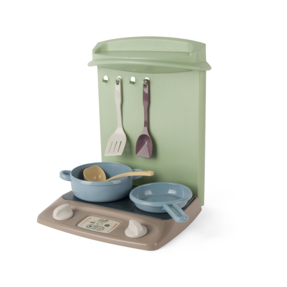 Man behøver ikke et helt samtalekøkken for at lave dejlig muddermad. Her er en lille kogeniche med kogeplader, pande, gryde, redskaber og hylde, så dit barn kan lave mad på selv den mindste altan.