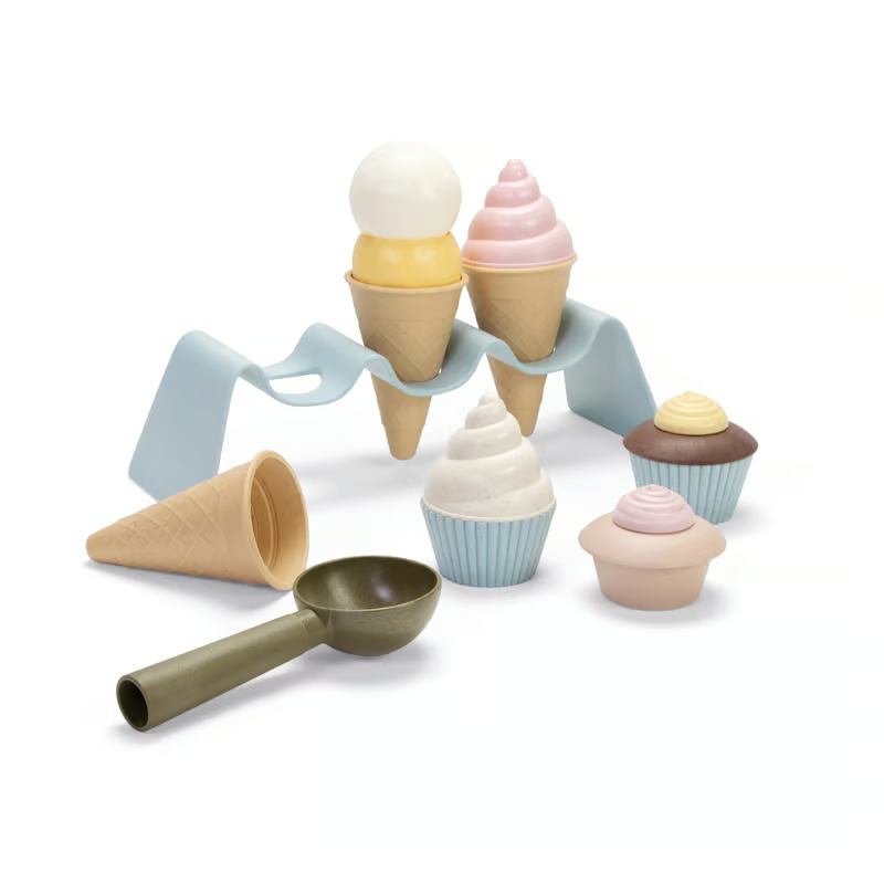 Uhmm er der noget så dejligt som is - det skulle da lige være is, der ikke smelter, så man kan lege med dem i sofaen. Her får dit barn nok dele til at samle lækre vaffelis at dele med dig eller måske sælge til gode priser fra legekøkkenet eller en improviseret isbod til bamserne. Hvad mon den gule smager af? Og er de to ekstra muffins eller is i bæger i dag?1 for fem og tre for 20? Leg med matematik eller træn at afgive og tage mod bestilling.Hele molevitten kan komme i opvaskeren. Fremstillet af restmateriale fra sukkerrørsproduktion.