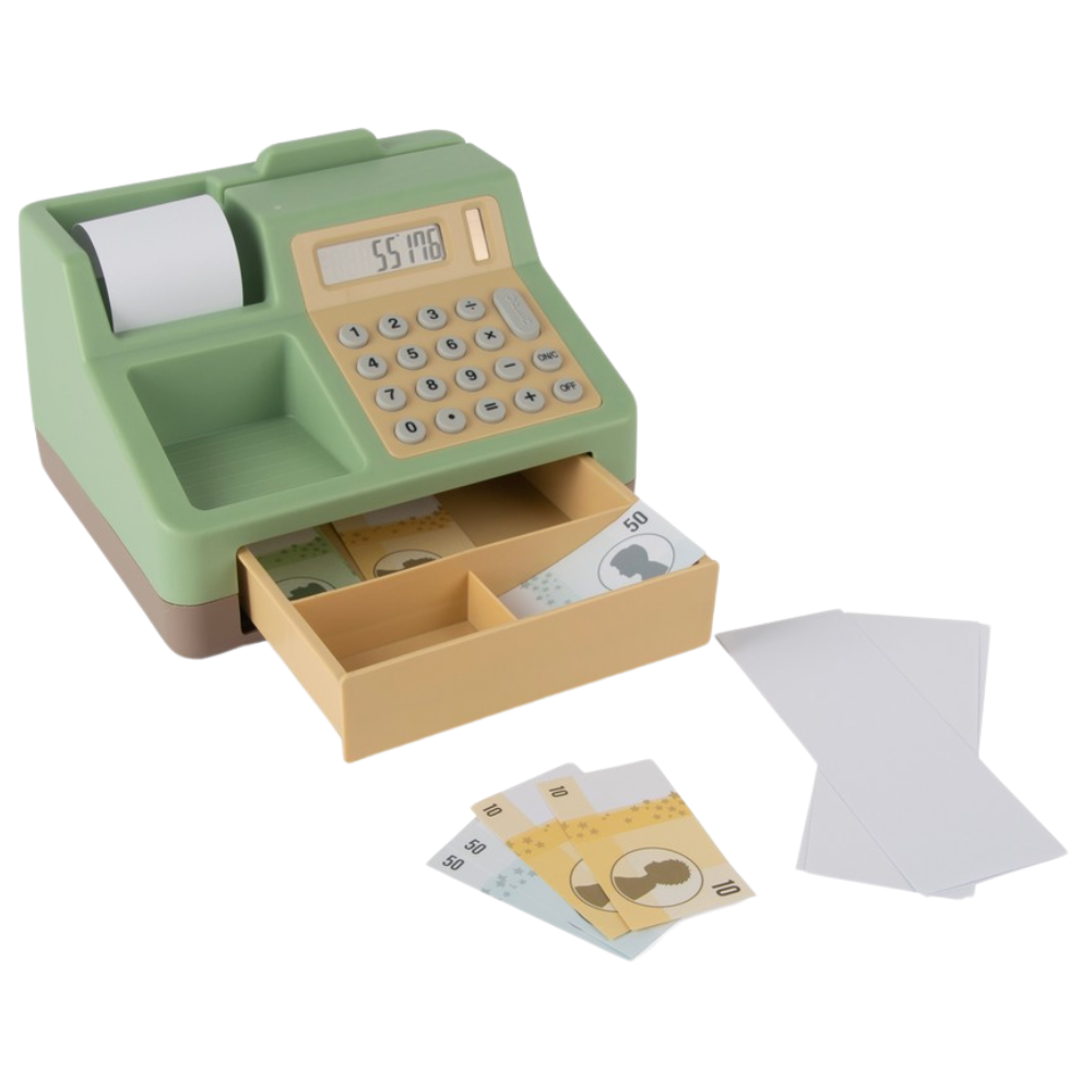 Når ungerne leger butik er det rart med et kasseappatat, så de kan lægge priser sammen og få styr på det samlede beløb. Måske er der en rabat, der skal trækkes fra? Eller måske er det sjoveste at se, hvor mange tal man kan få til at være på skærmen?Lad legen foregå indendørs - solcellerne skal nemlig opbevares tørt. Det kan dog godt tåle en fugtig klud, hvis (når) det bliver nødvendigt.Der følger legepenge med, så børnene kan forhandle om at skiftes til at betale og tage imod betalingen. Måske skal der gives penge tilbage?