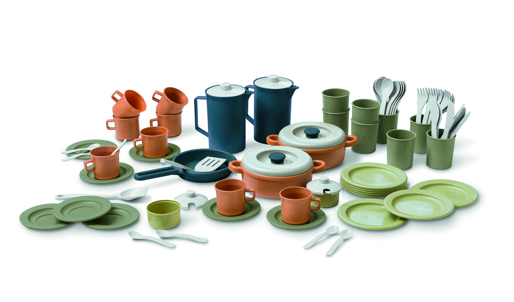 Med dette spisestel af danskproduceret BIOplast, kan en hel gruppe børn dække fint bord og spise et fint, afrundet måltid med kaffe bagefter, serveret med flot service. Spisestellet er til hele 8 personer med tallerkener, bestik, kopper og krus og det hele. BIOplast er et ganske særligt materiale, som er fødevaregodkendt. Det vil sige, at man kan bruge det til at spise af, for det er så stabilt, at det ikke afgiver indholdsstoffer eller bliver skævt af at blive vasket op i varmt sæbevand eller i opvaskeren.Dantoys BIOplast er ikke skabt til at være bionedbrydeligt i naturen, da det vil betyde begrænset holdbarhed, hvilket ikke er bæredygtigt. Til legetøj, hvor der er forbrugt ressourcer til at formgive og indpakke varen, er det mere meningsfuldt at legetøjet har en lang levetid. Bionedbrydelig giver bedre mening til fx fødevareemballage, hvor der ikke er en ret lang produktionsproces eller ret meget emballage.Dette legetøj er derfor ikke skabt til at blive smidt ud, men brugt i mange år og derefter afleveret som hård plast til genbrug, så ressourcerne ikke bliver spildt. For hvert kg produceret BIOplast fjernes 3,09 kg CO2 fra atmosfæren.
