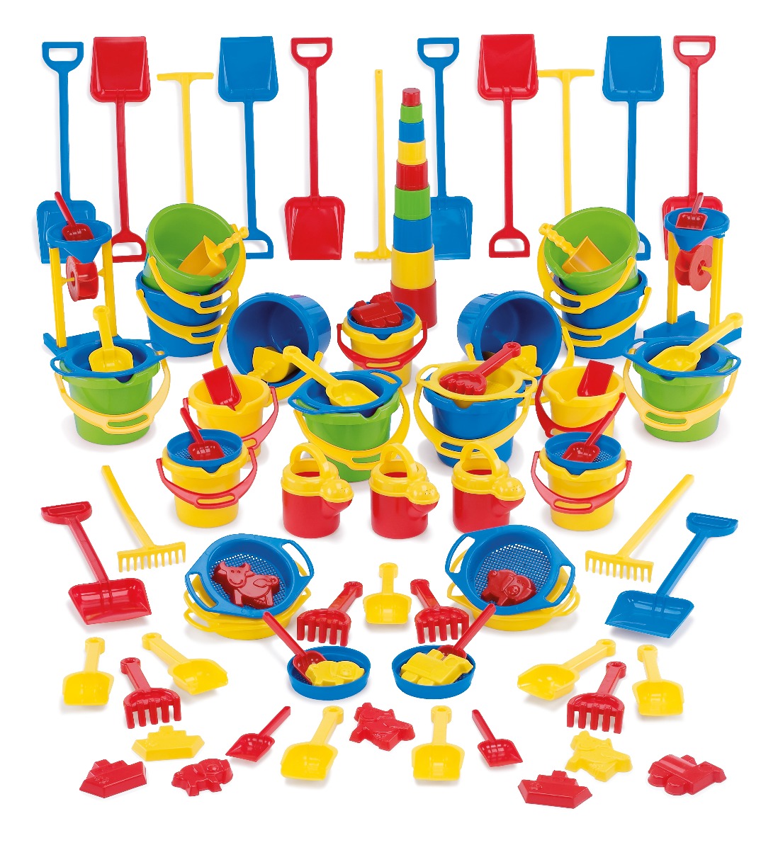 Med dette store sæt kan alle små entreprenører arbejde på samme tid. Der er nemlig rigeligt med dele.Nogen, kan bygge en kæmpemæssig ridderborg, mens andre bygger sandslotte med vandfyldte voldgrave omkring.Når de er flere om at skabe, træner de naturligvis samarbejde og sociale spilleregler.Børnene udvikler fantasi og finmotorik, samtidig med at sandet og vandet stimulerer deres følesans.Alle dele kan rengøres i opvaskemaskinen, men skyl dem gerne for sand først.
