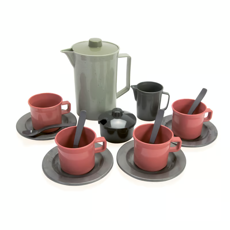 Her kan fire venner, dukker eller bamser blive inviteret til kaffeslabberas - et ord vi lige skulle slå op for at kunne stave det rigtigt. Sættet er produceret af Dantoy af Svanemærket plast, som er til overs i deres øvrige produktion. Derfor er der nok farveforskel mellem billederne og det sæt, du køber, for det kan være i alle mulige farver.
