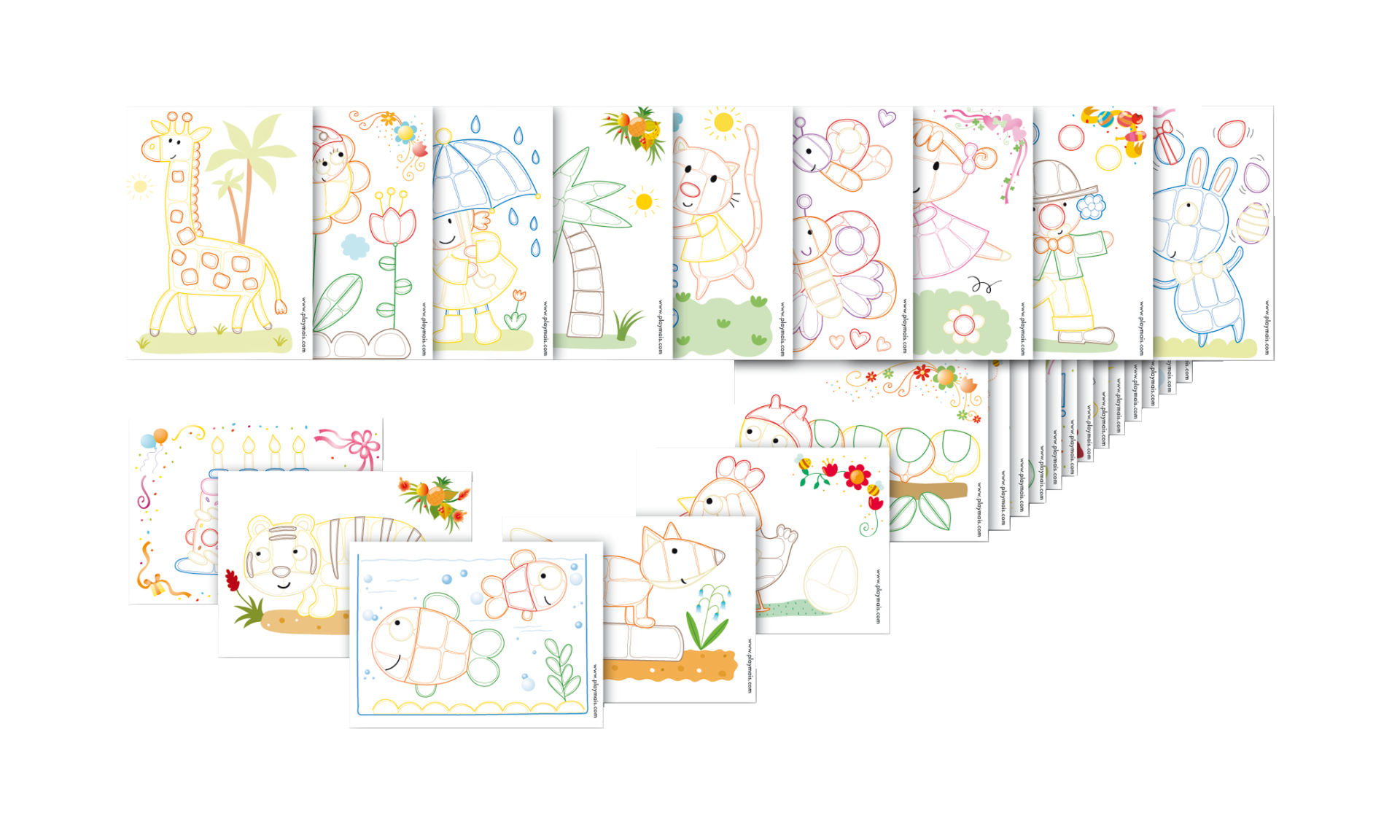 PlayMais er så smart indrettet, at de kan mases i facon og derefter fugtes med vand, og så kan de klæbes fast på disse fine dekorationskort. Når dit barn dekorerer et kort, fungerer det ligesom at lave mosaikker. De forskellige kort forestiller dyr og børn, og alle kort har forskellige felter med et farvet omrids. Det gælder så om at finde den rigtige farve PlayMais og sætte fast på kortet i felterne, så der til sidst opstår et kunstværk.