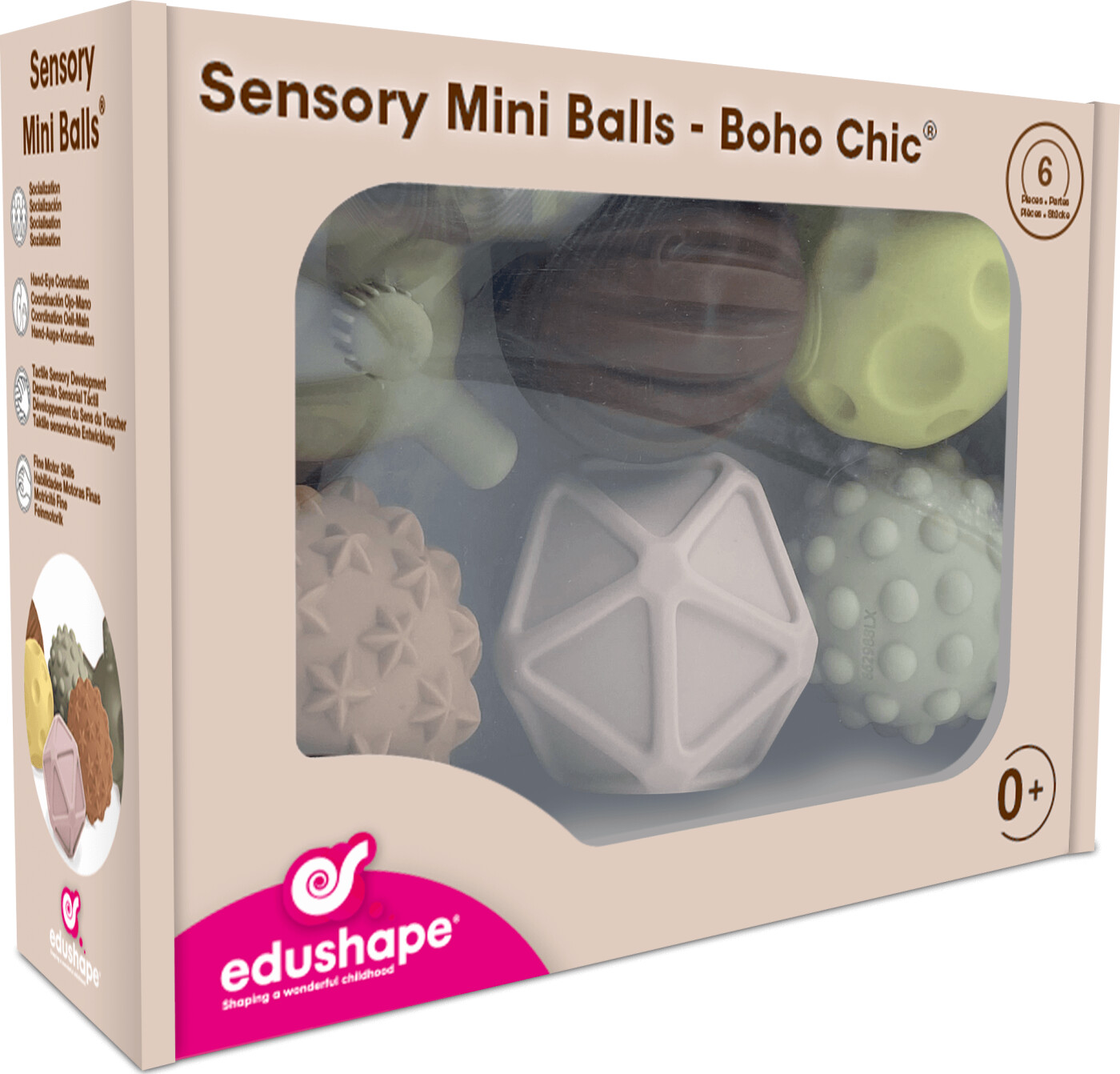 Sættet indeholder seks farverige og bløde bolde med forskellige strukturer og overflader, der...