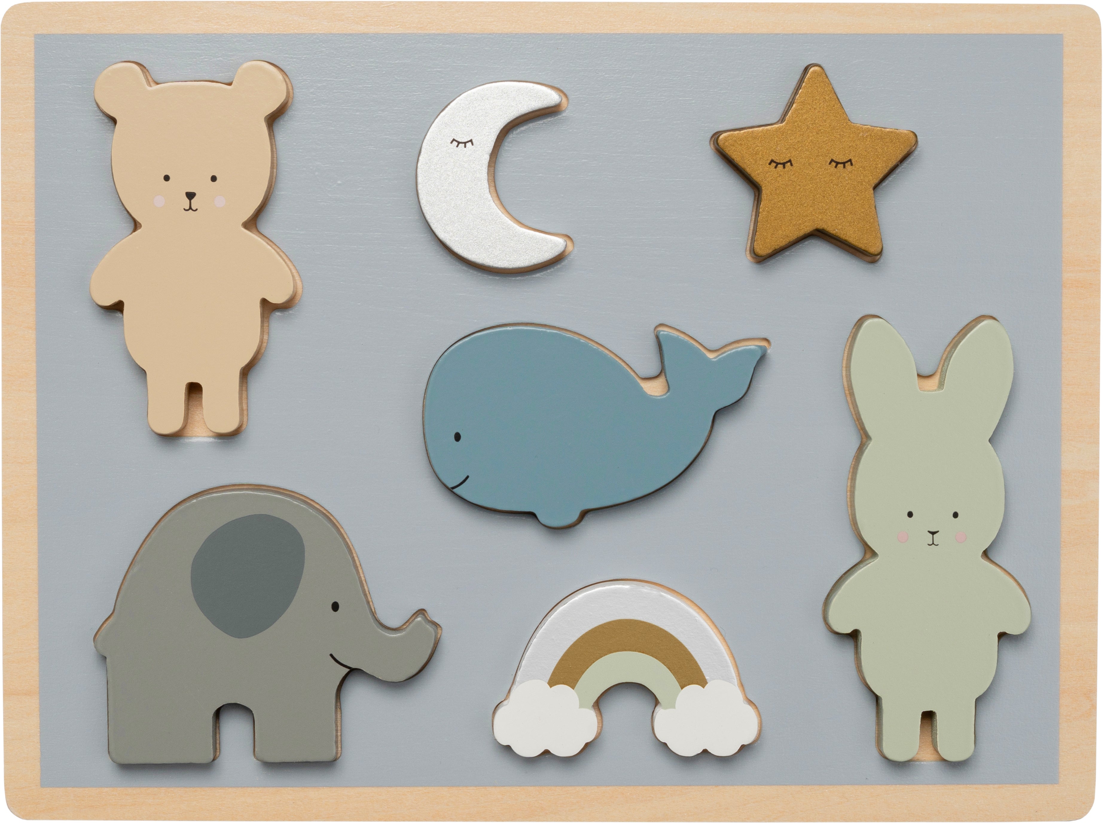 Puslespil fra Jabadabado med syv fine figurer. Perfekt til træning af dit barns koordination og finmotorik. - Let for små hænder at gribe om. - Perfekt til udvikling af finmotorikken. - Udvikler hånd-øje-koordination. - CE-mærket. - Anbefalet alder: Fra 1,5 år. - Træ.