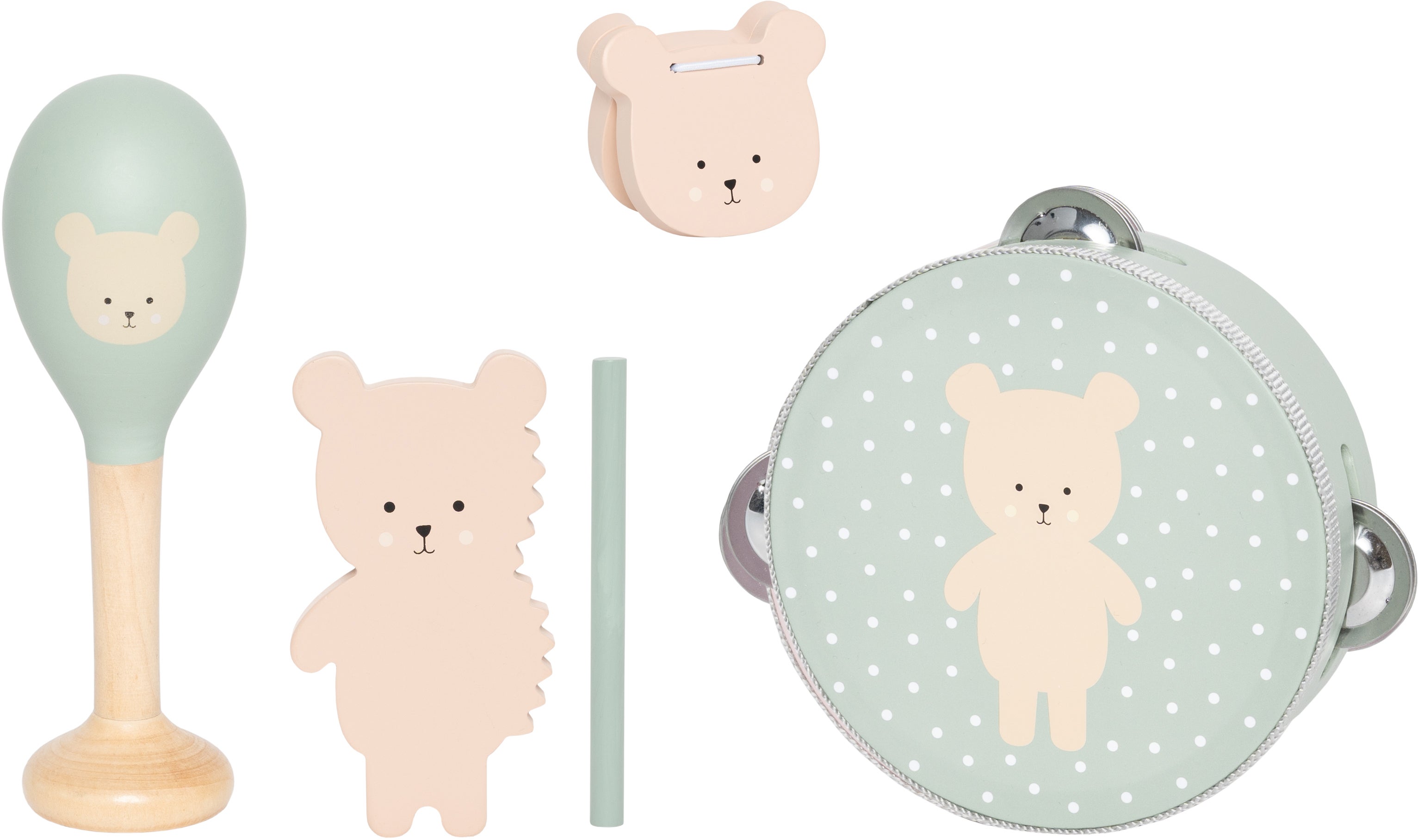 Musiksæt fra Jabadabado med en masse instrumenter at udforske. Perfekt til den lille musikant. - Indeholder: 1 guiro, 1 tamburin, 1 maraca, 1 kastagnetter. - Sødt design. - Velegnet til begyndere. - Lav dine egne melodier. - Fremmer musikalsk engagement. - CE-mærket. - Anbefalet alder: Fra 3 år. - Træ.