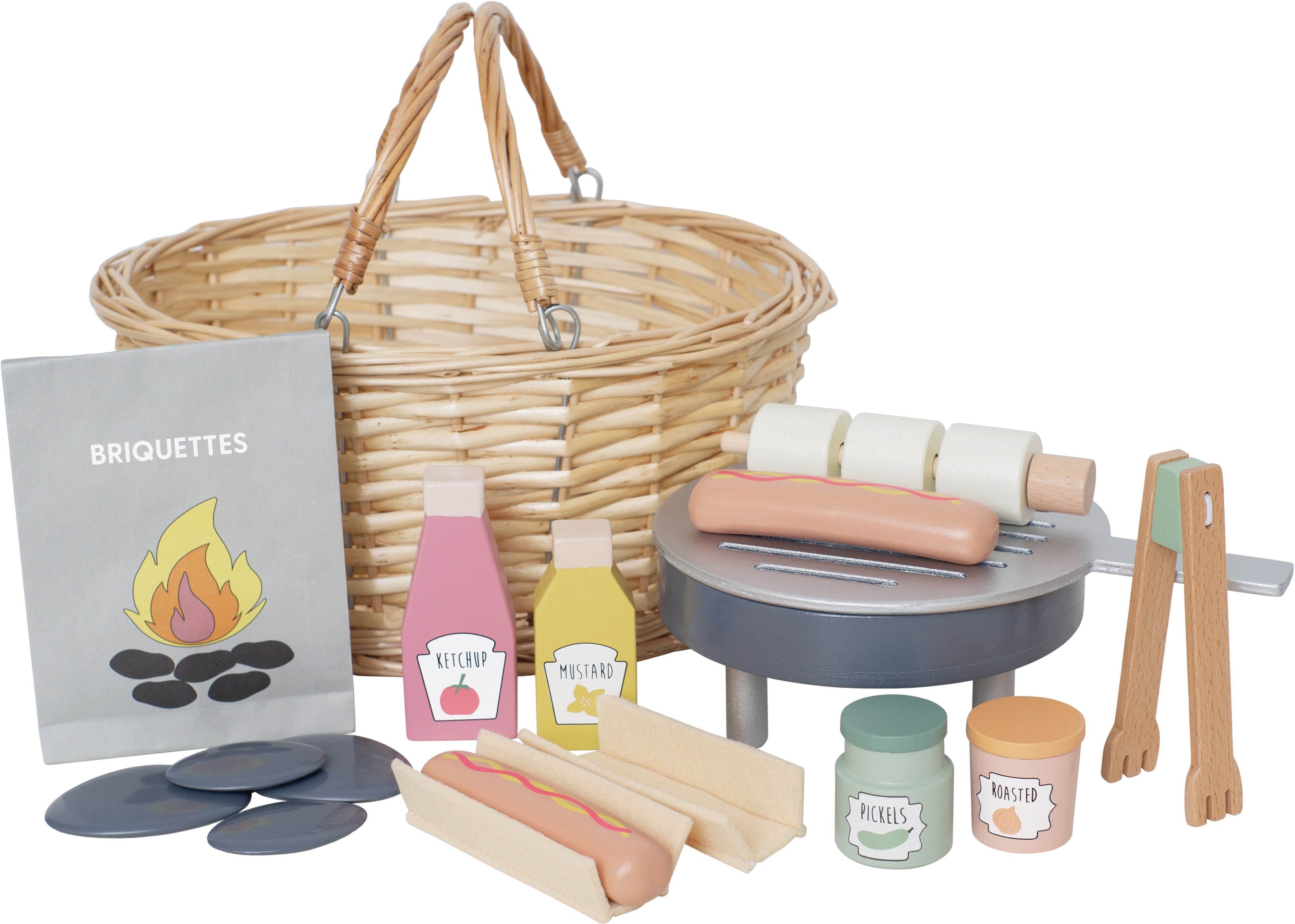 BBQ fra Jabadabado med et detaljeret design. Den har en masse sjovt tilbehør at udforske. Perfekt til timevis af fantasifuld leg. - Indeholder: 1 grill med en grillrist, 4 briketter, 1 ketchupflaske, 1 sennepsflaske, 1 glas med agurk, 1 bøtte med ristede løg, 1 kurv, 2 hotdogs, 2 BBQ-redskaer. - Detaljeret design. - Let at opbevare. - Let for små hænder at gribe om. - Opmuntrer til sjov rolleleg. - Let at rengøre med en fugtig klud. - CE-mærket. - Anbefalet alder: Fra 3 år. - Træ.