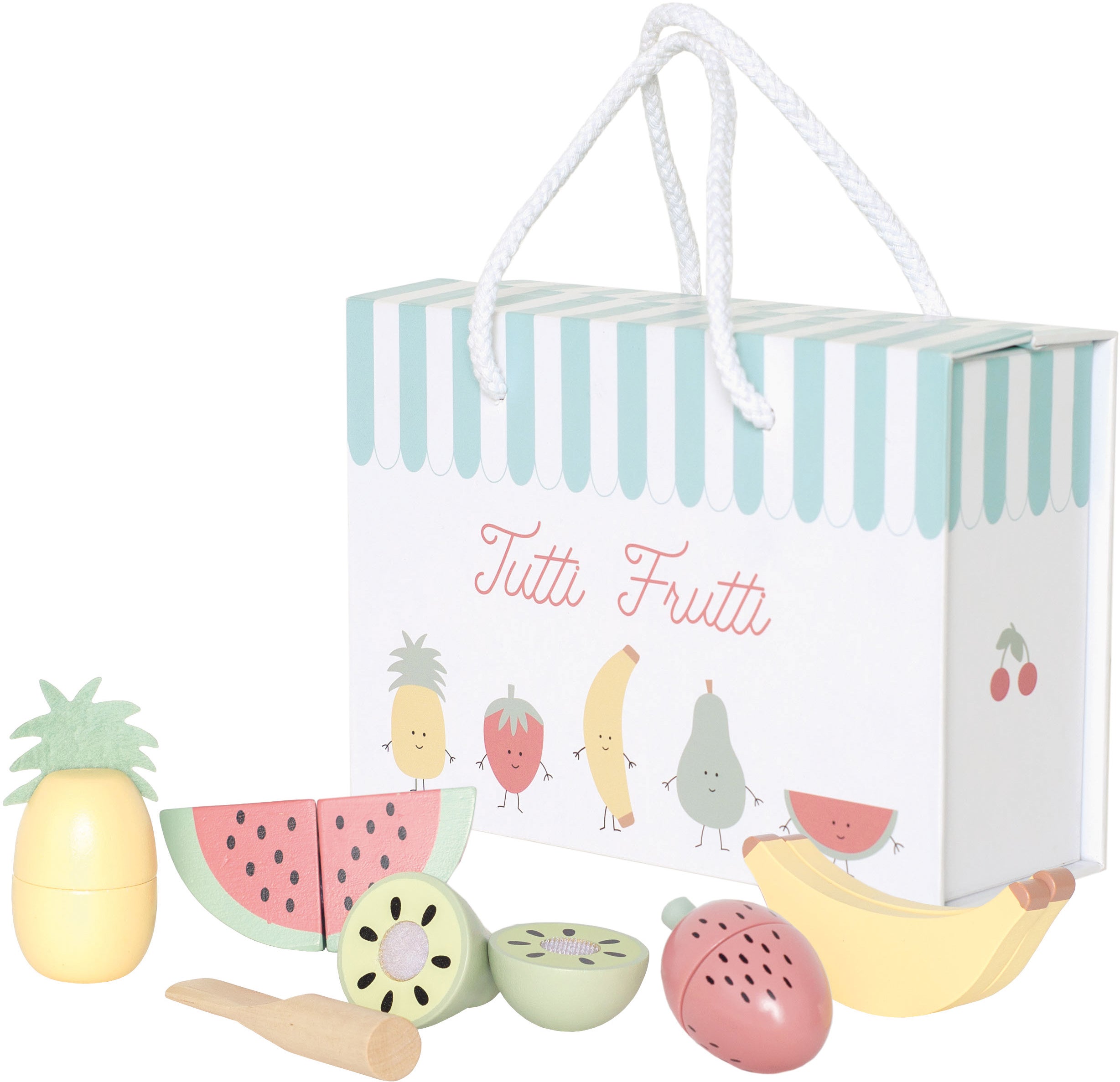 Frugter fra Jabadabado med et sjovt design i flotte farver. Perfekte til mange timers sjov. - Indeholder: 1 boks, 5 frugter, 1 legetøjskniv. - Flot design. - Holdes sammen med velcro, så de adskilles realistisk, når de skæres i skiver. - Opmuntrer til sjov rolleleg. - Kun fantasien sætter grænserne. - CE-mærket. - Anbefalet alder: Fra 1,5 år. - Træ.