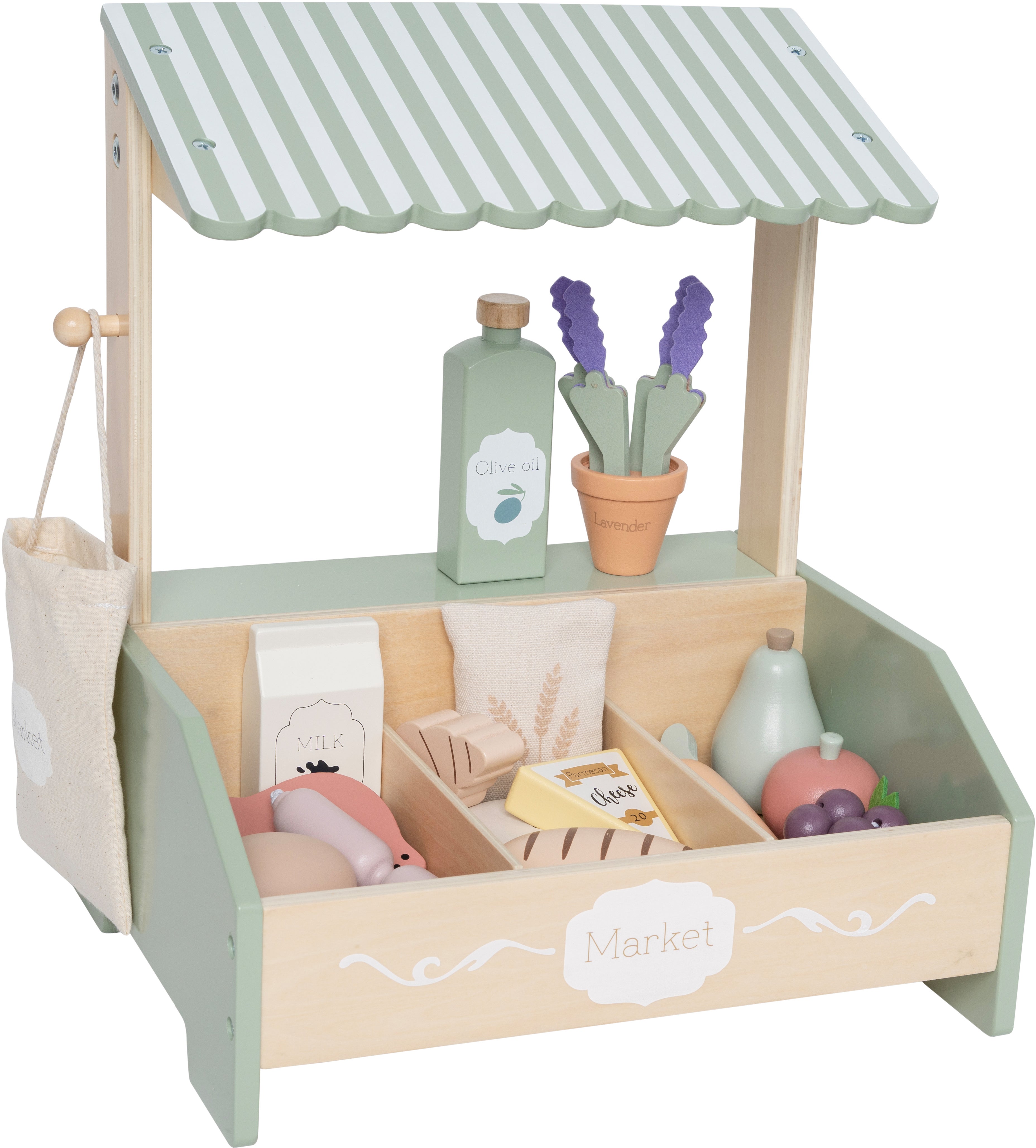 Markedsbod fra Jabadabado med et stilfuldt design i flotte farver. Den har masse spændende tilbehør at udforske. Perfekt til timevis af fantasifuld leg. - Indeholder: 1 markedsbod, 1 mulepose, 16 tilbehør. - Tre rum. - Let at montere. - Let for små hænder at gribe om. - Kompakt design. - Opmuntrer til sjov rolleleg. - Let at rengøre med en fugtig klud. - CE-mærket. - Anbefalet alder: Fra 3 år. - Træ, stof.