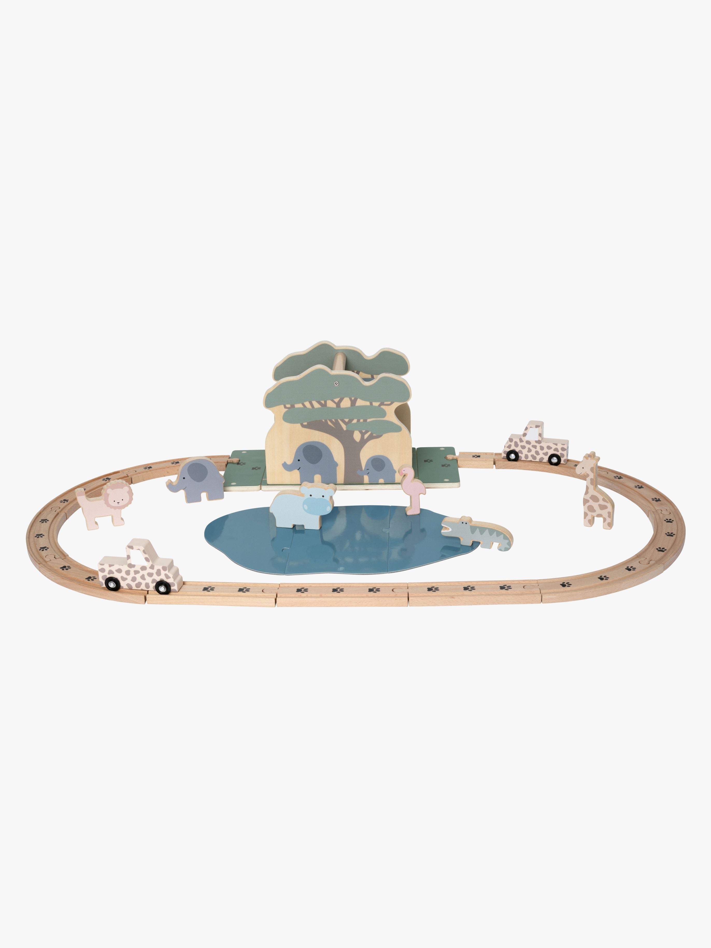 Togbane fra Jabadabado med en masse fine tilbehør. Den har to fine safaribiler klar til eventyr og masser af spændende safaridyr at udforske. Perfekt til den lille eventyrer. - Indeholder: 1 togbane med safaritema, 2 safaribiler, 6 safaridyr, 1 vandhul. - CE-mærket. - Anbefalet alder: Fra 2 år. - Træ.