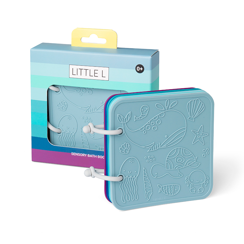 Fin badebog i blå nuancer med sider, der er nemme at vende og fulde af havdyr.Måske kan en større søskende låne badebogen og bruge den til frottage, hvor man lægger et papir over og så bruger den brede side af fx farvekridt til at gnide over papiret.Tåler en tur i opvaskeren. 8 sider.Af fødevaregodkendt silikone så den er helt tryg at gnaske på.