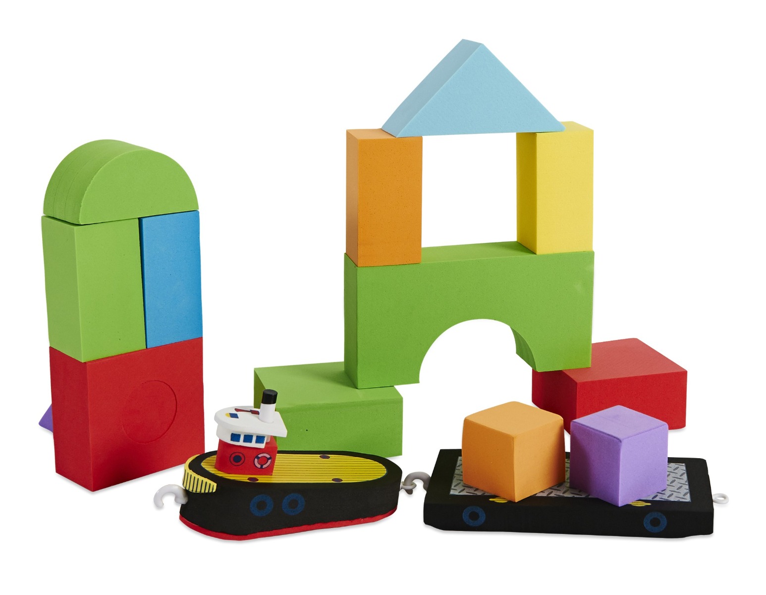 Gør badet sjovt og stimulerende med dette farverige legesæt med klodser og slæbebåd.Denne pakke er et godt begyndersæt for det barn, der skal lære hele BathBlocks univers og funktioner at kende.Dit barn kan trække båden gennem vandet, og prammen følger efter. Som med alle sæt fra BathBlocks, så kan klodserne nemlig klistre til hinanden, når de bliver våde. Derudover er det sjovt at bygge klodser op på pramdelen. Gad vide hvor mange klodser den kan holde til - især når der kommer høje bølger i badevandet.Sæt med 16 dele.Lavet af hårdt skum.