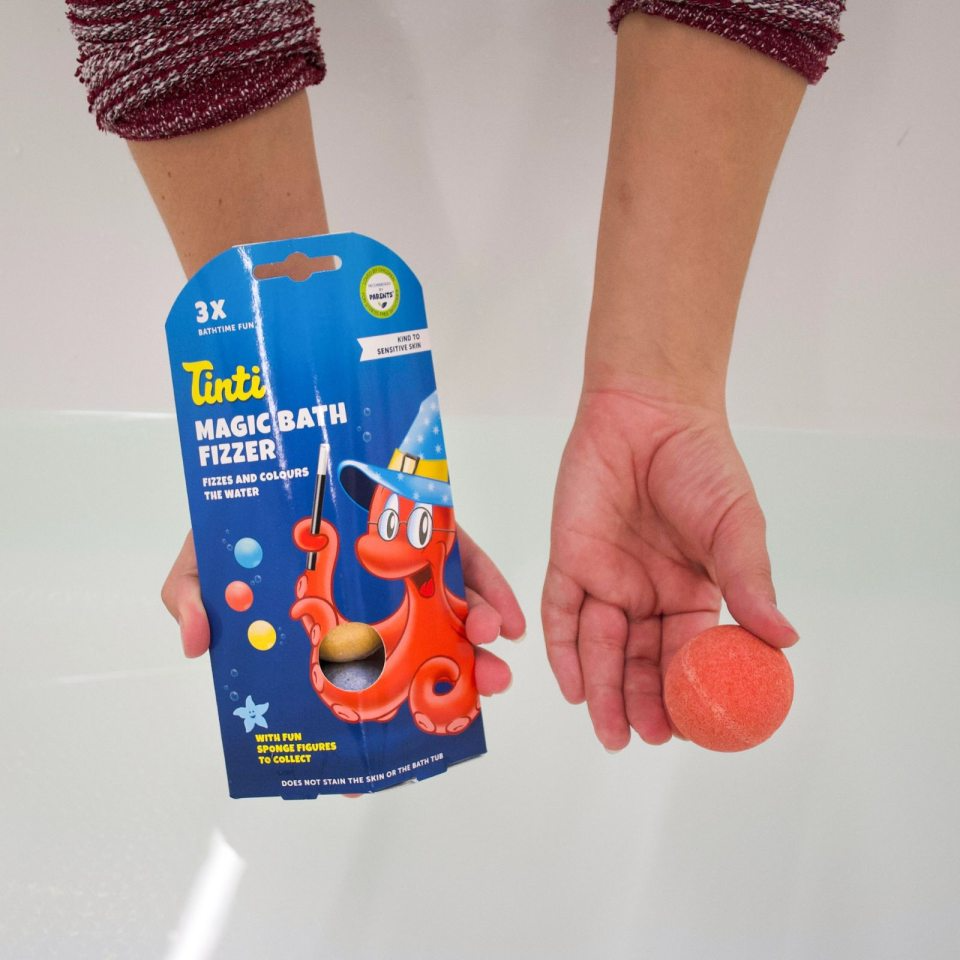 Kunne det ikke være sjovt, hvis dit barns bad både havde en flot farve, boblede lækkert og fik en herlig duft?Put en tryllekugle i vandet, og så skal I bare se. Her er 3 stk.Tintis produkter til knitrebad og farvet badevand er dermatologisk testet og kan også bruges til børn med sart hud. Farverne bliver ikke siddende på huden eller på fliserne. Farverne er lavet af fødevare-farver, som er helt ugiftige.Duften er dermatologisk testet.